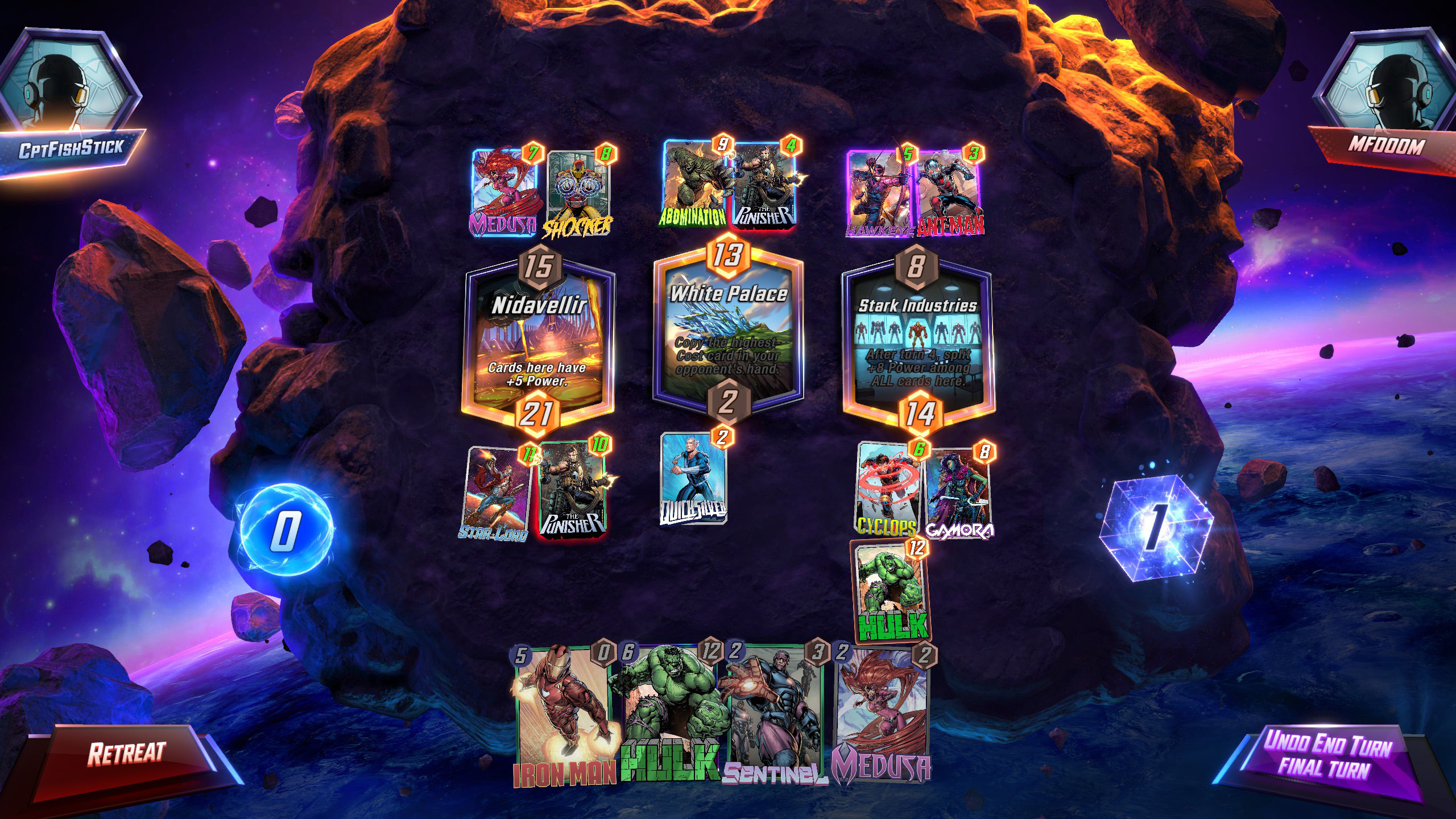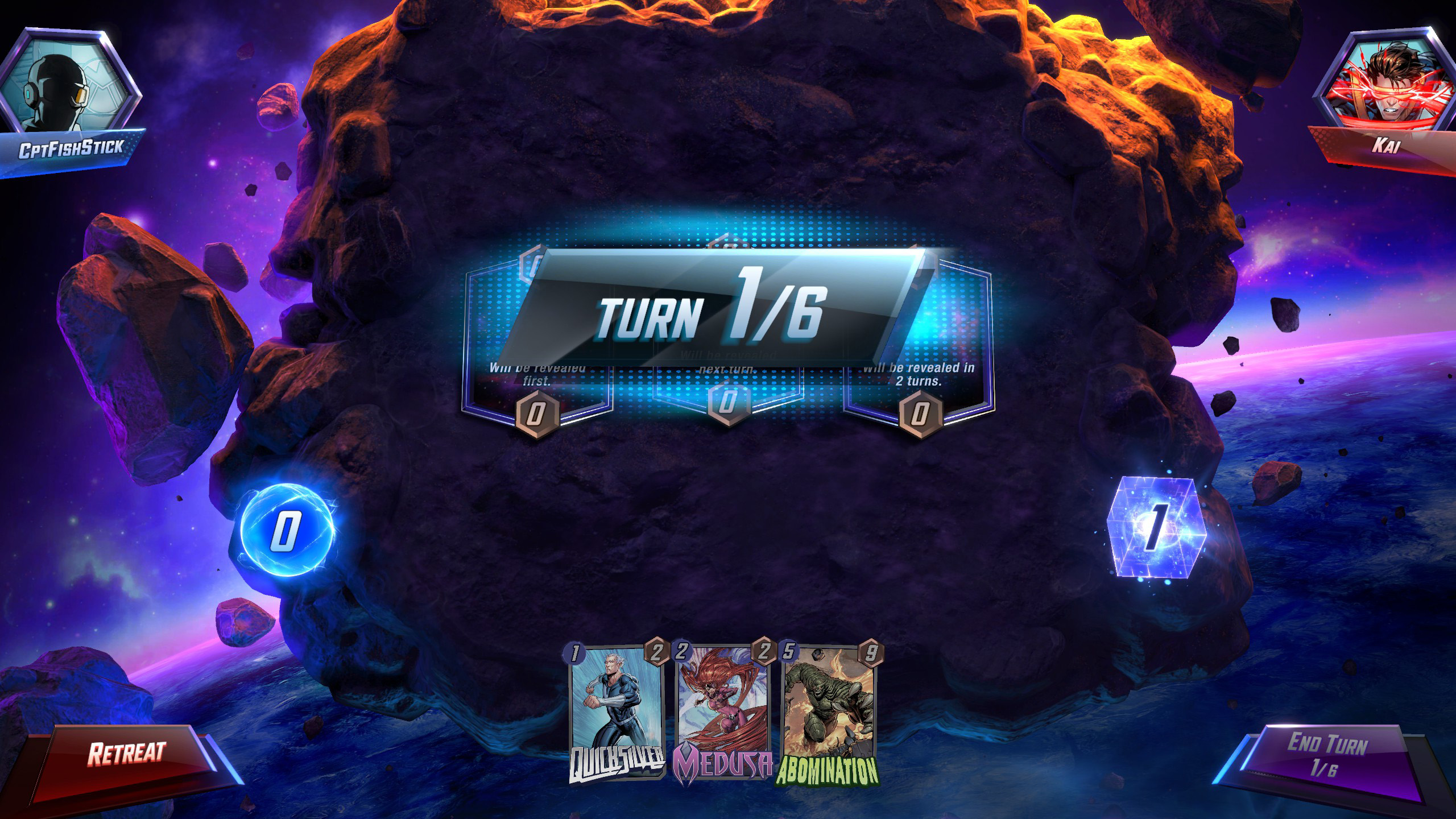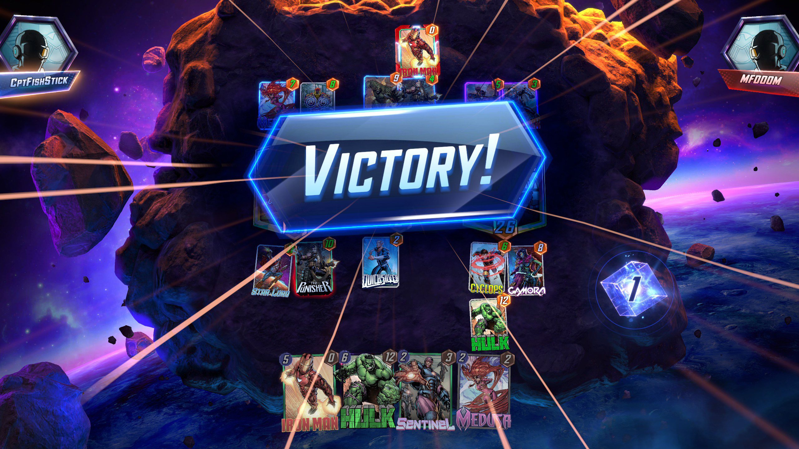 In the game, players have a deck of 12 cards that can be customized. Cards depict Marvel characters with various specifications: cost, power level, and a special ability. Accross 6 rounds players play one or more cards face down. Which cards and their location is determined based on player choice and variables in the game. Various game factors are randomly assigned for each match, and revealed one by one in the first three turns. Whoever has the highest power at each location wins that location. Players must win 2 out of 3 of the locations to win the game. New cards, characters, variants, and powerups can be unlocked using in game tokens/currency. Players also earn various in-game purchasing tokens, as the game is based on a monetization model. There are over 1000 variants of cards in the game, which are cosmetically different, but functionally identical.
