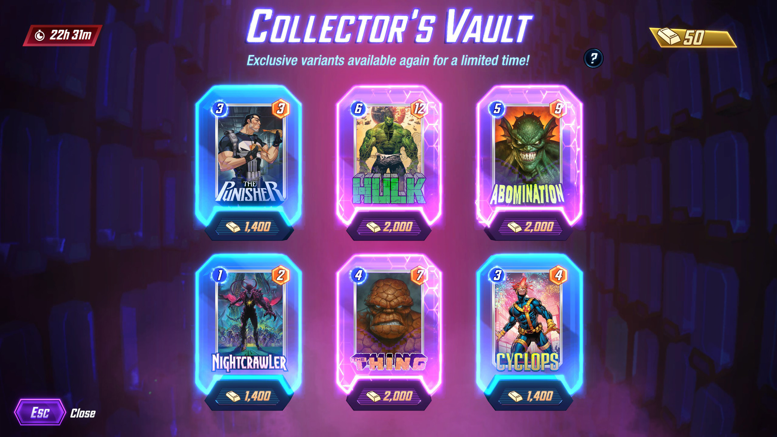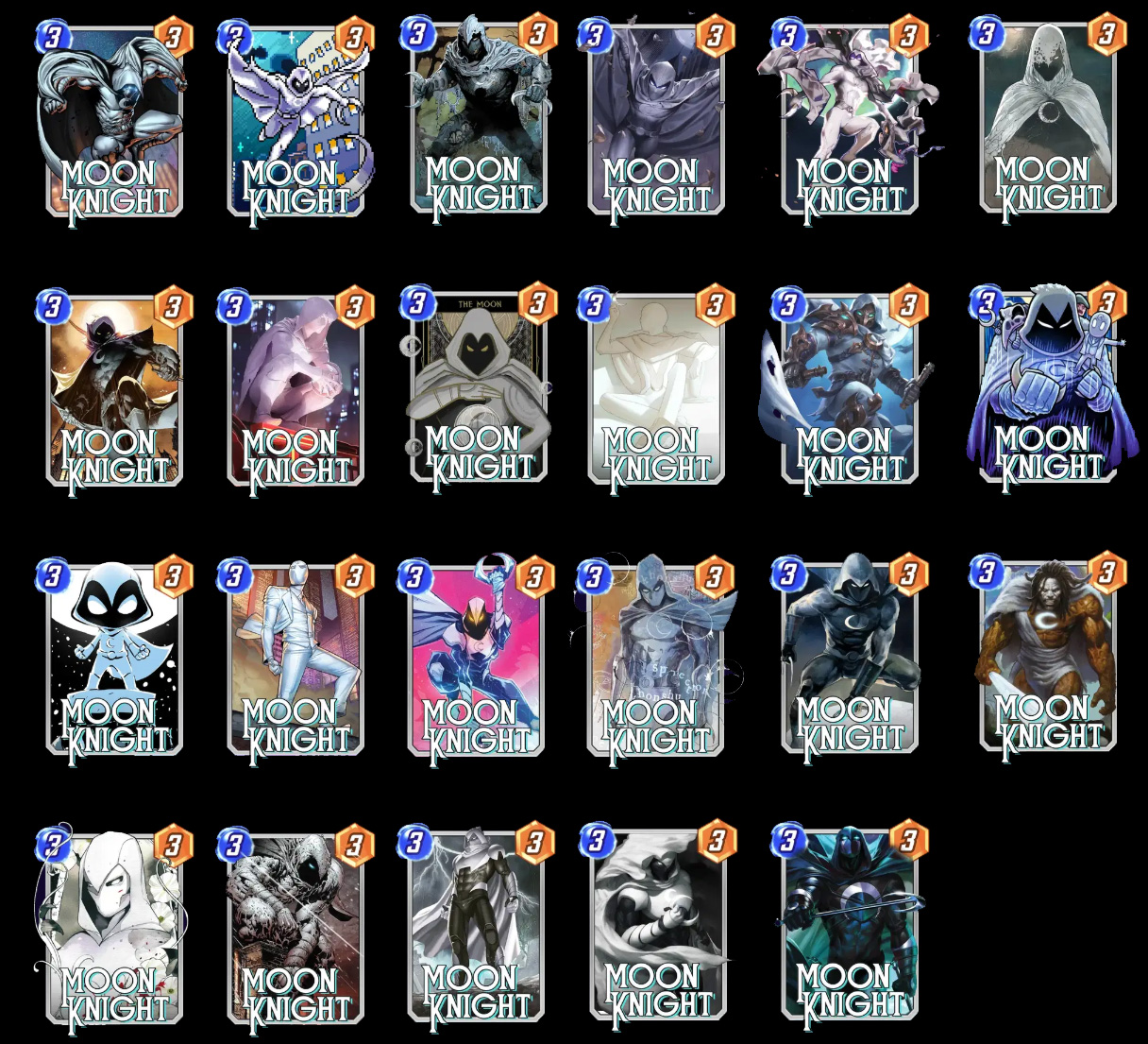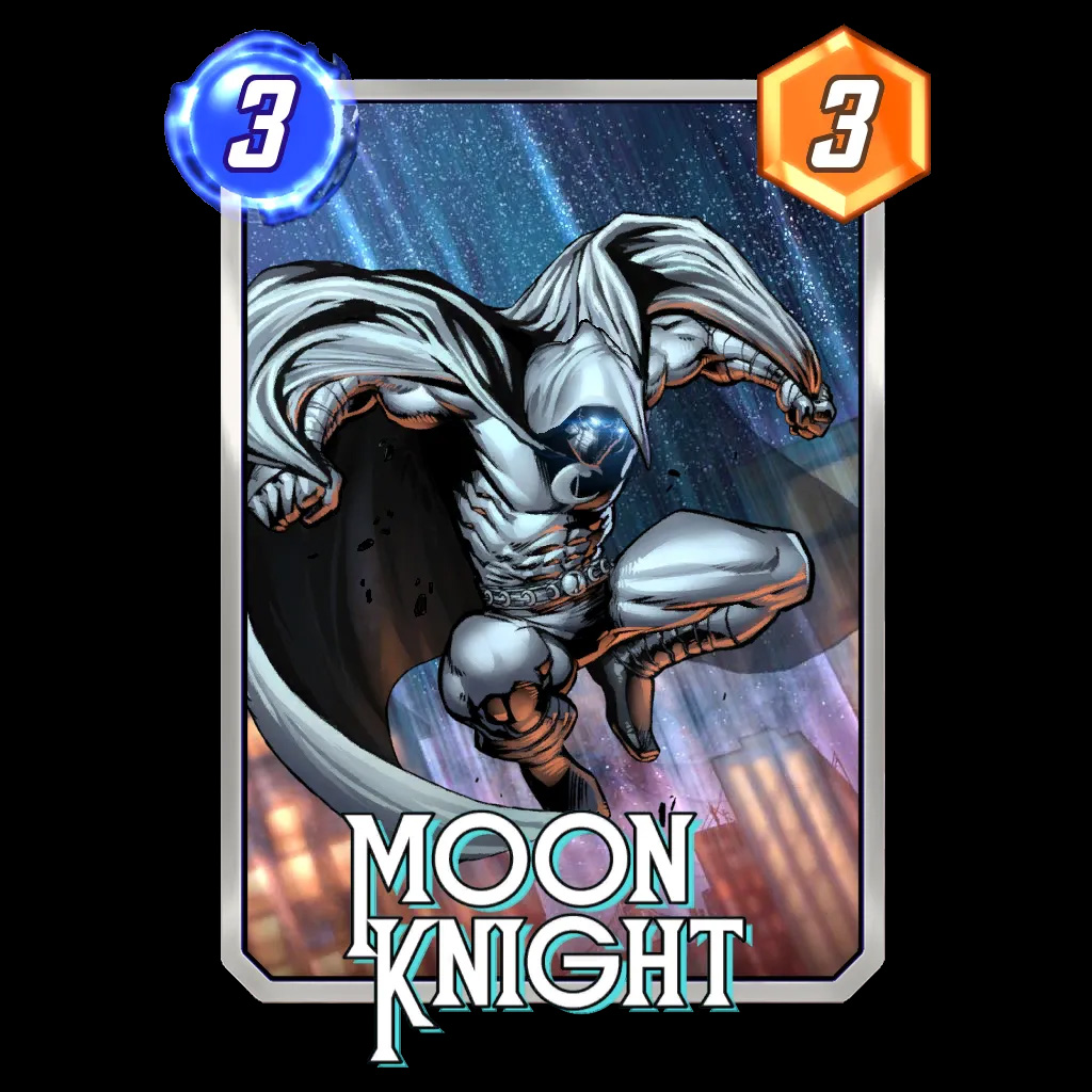 Moon Knight is a featured character in the game, and released as part of series 3, but must be unlocked. Moon Knight has a 3 cost, and 3 power rating. His special ability is: "On Reveal: Discard an even-costed card from each player's hand" There are at least 23 variants of Moon Knight in SNAP. Khonshu is also featured in SNAP.