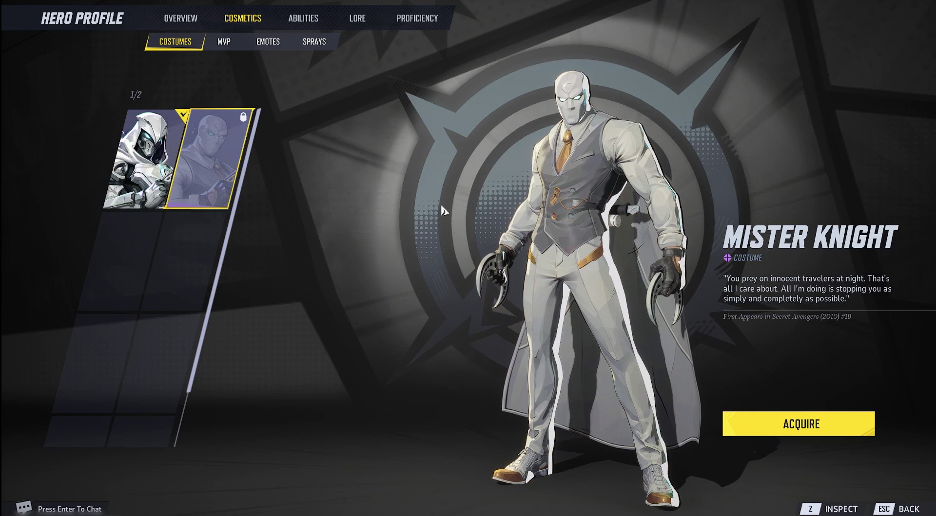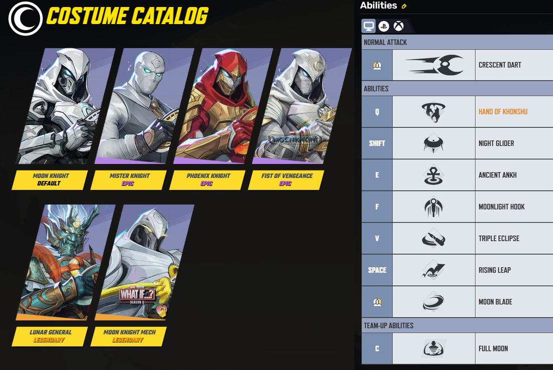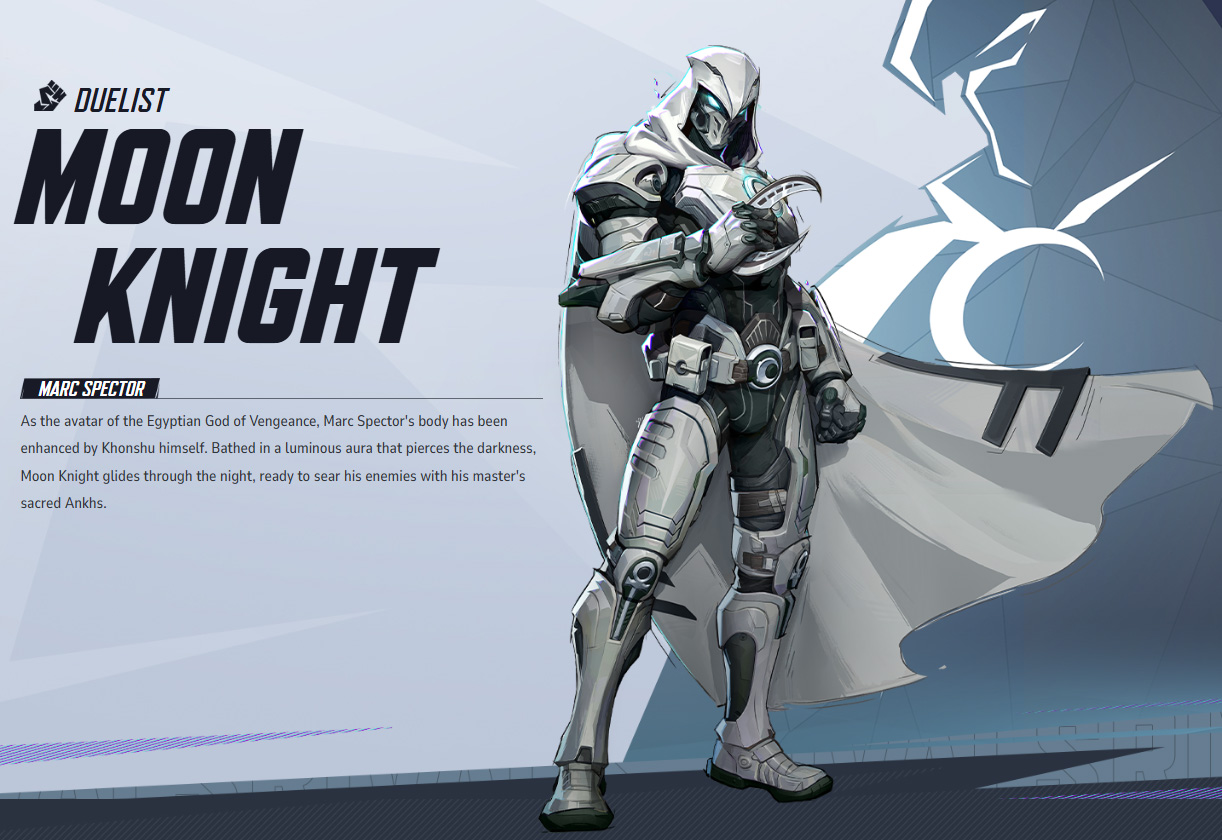 The player rosters is ever increasing, with 43 playable characters as of October 2025. One of the characters available on release was Moon Knight. Moon Knight is a Duelist character type, which is an offensive type role intended to secure kills. He has a long ranged Crescent Dart Attack, Double Jump ability, Gliding, as well as a grappling hook. Without purchasing cosmetics, the player is only able to select his default skin/costume, which is based on his more traditional outfit featuring his trademark hood and cape. There are 5 other costumes that can be unlocked or purchased. 3 of them are categorized as “Epic”: One based on his Mr Knight Persona, Another on his Phoenix Night costume, and the Fist of Vengeance skin incorporates golden accents. The final two, designated “Legendary” status are not based on any comic iteration. The first is the Lunar General, which has Chinese elements, and the other which is the Moon Knight Mech incorporates Japanese Mecha elements.