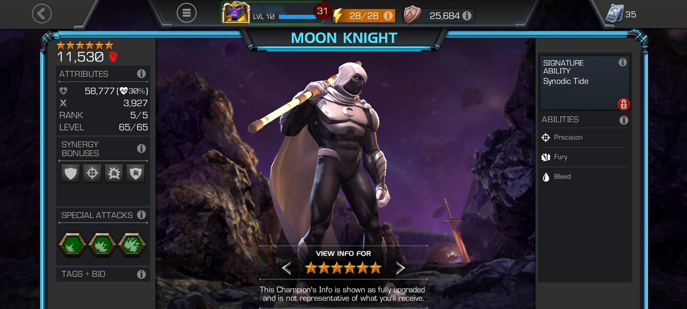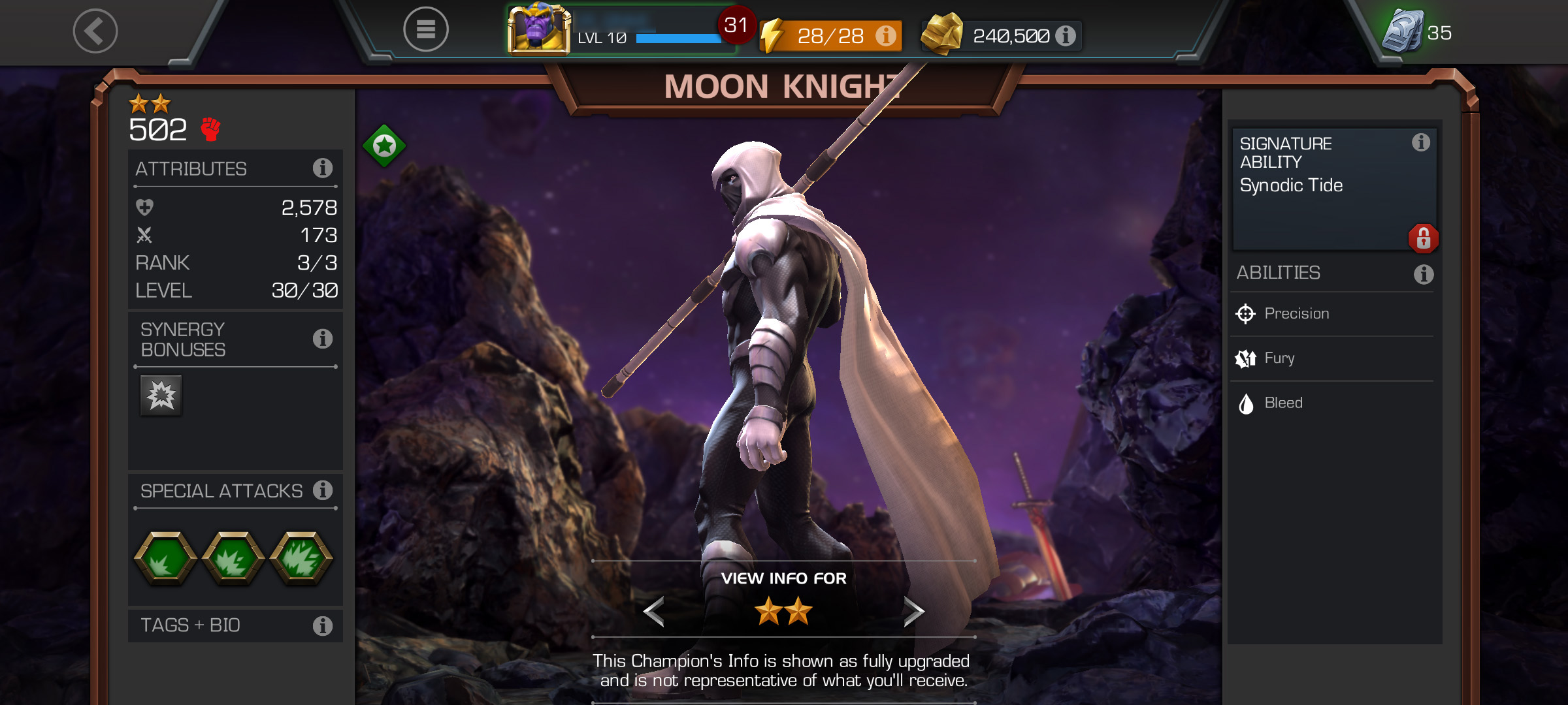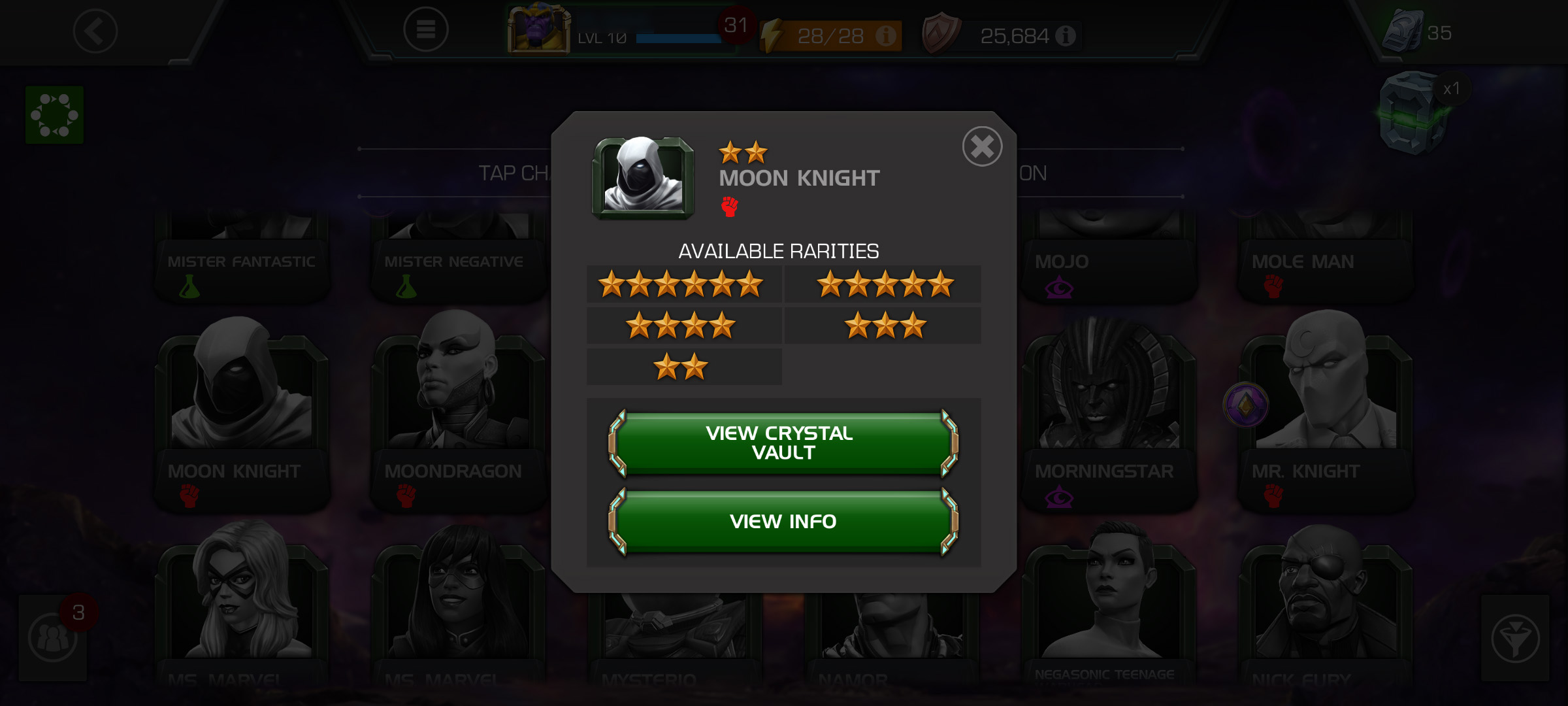 Marvel Future Fight by Netmarble games is a RPG strategy game for mobile devices. It is based heavily on the use and management of character stats and abilities. Although you only control one character at a time, you manage a team that can include any of the 187 playable characters within the game. Many of these characters must be unlocked, including Moon Knight. Characters can be leveled within three teirs which grant them special abilities and attacks. Some of these abilities are based on their chosen costume, of which Moon Knight has 2.
