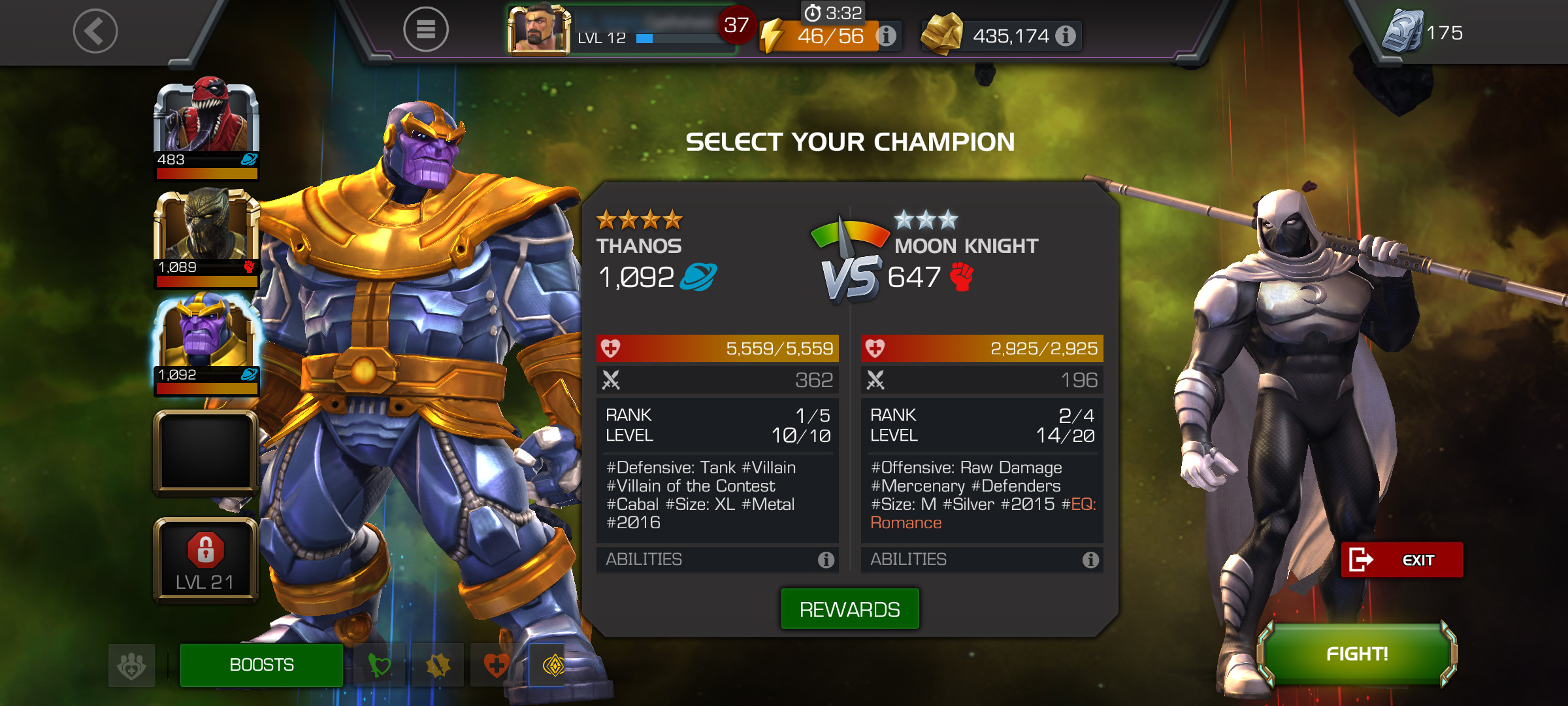 Contest of Champions is a fighting game based off of the famed comic book mini-series. It is a fast paced game with limited controls due to the touch interface of smart phones. It, however, features complex resource and team management aspects. It also has pay-to-play features allowing players to purchase in game currency used for unlockables and customization. Only a few characters are immediately playable, with all of the others requiring some level or acheivement to unlock.